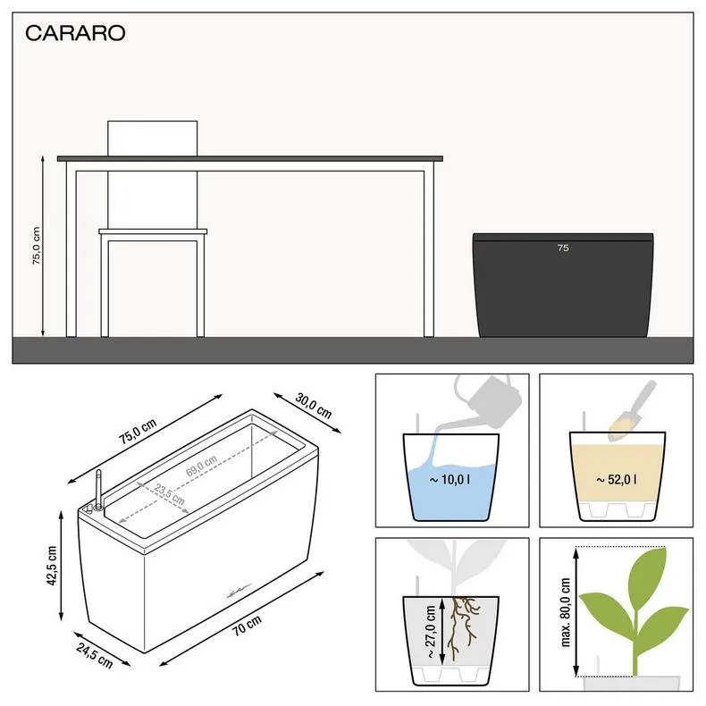 Серия CARARO помогает создавать интерьер в больших помещениях, открывает перспективы, отделяет и объединяет жилые помещения, расставляет нужные акценты и помогает придать помещению вид, соответствующий Вашим представлениям. Благодаря своей ширине 75 сантиметров модели этой серии выполняют, помимо функции кашпо для растений, также функцию перегородки. Любите изменения? Благодаря включённым в комплект поставки роликам модели серии CARARO всегда остаются мобильными.