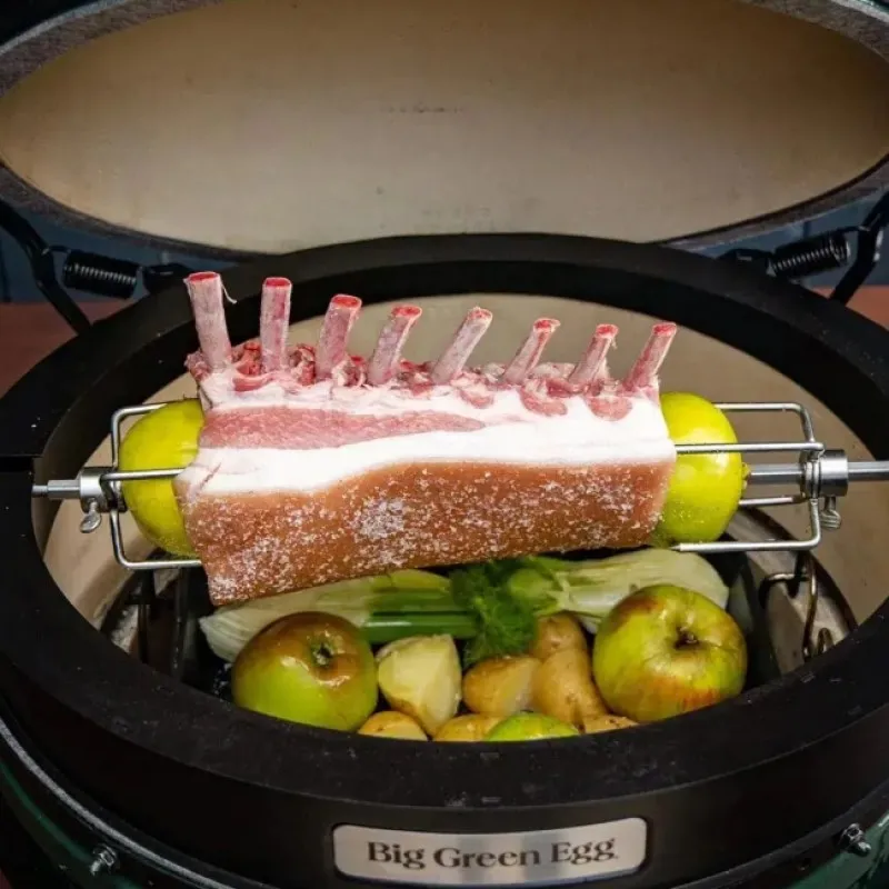Вкусная курица, запеченная на углях, сладкий и сочный ананас, красивый рулет или домашний гирос или шашлык, запеченный на вертеле? Теперь вы можете легко приготовить все эти блюда самостоятельно в Big Green Egg благодаря набору для гриля — фантастическому новому дополнению к вашему Big Green Egg. Возможности безграничны. Ваши ингредиенты будут постоянно пропитываться выделившимся жиром и/или соком, что придаст им еще больше аромата. Вы можете использовать набор для гриля с конвектором или без него, в зависимости от того, что вы готовите, и температуры EGG.