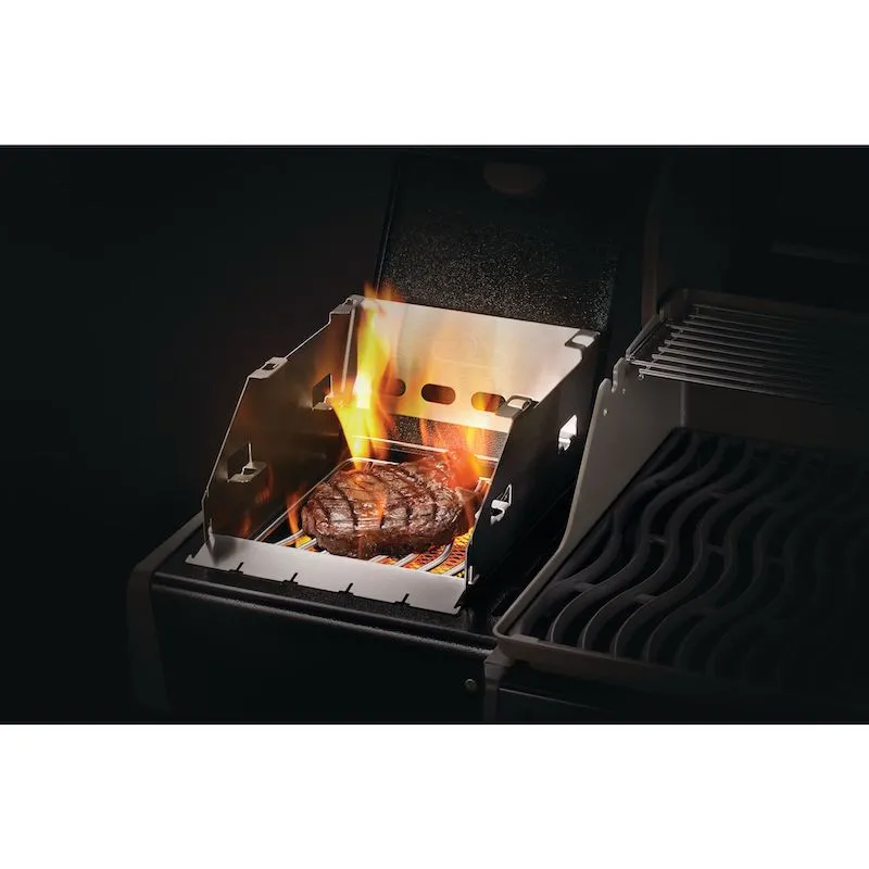 Многофункциональная ветровая защита для боковой горелки Sizzle Zone в грилях Napoleon. Даже при сильном ветре Sizzle Zone будет стабильно гореть. Решётку гриля можно установить в три дополнительных положения. Переднюю панель можно сложить, чтобы облегчить доступ к щипцам для барбекю. Кроме того, встроен держатель для шампуров, что позволяет жарить шампуры над керамической горелкой без прямого контакта с решеткой.