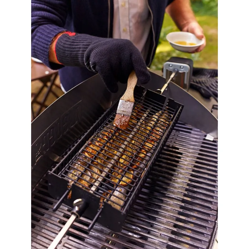 Жаропрочные перчатки изготовлены из специального термостойкого материала и надежно защитят руки от сильного жара в гриле, а специальные полоски из термостойкого силикона обеспечат надежное сцепление. Аксессуары никогда не выскользнут у вас из рук. Перчатки отлично подойдут для работы с различными аксессуарами и при очистке гриля. Жаропрочные перчатки для гриля Weber - то, что нужно для защиты от высокой температуры. Перчатки имеют силиконовый рисунок на ладонях, чтобы можно было надежно удерживать посуду и рабочие инструменты.