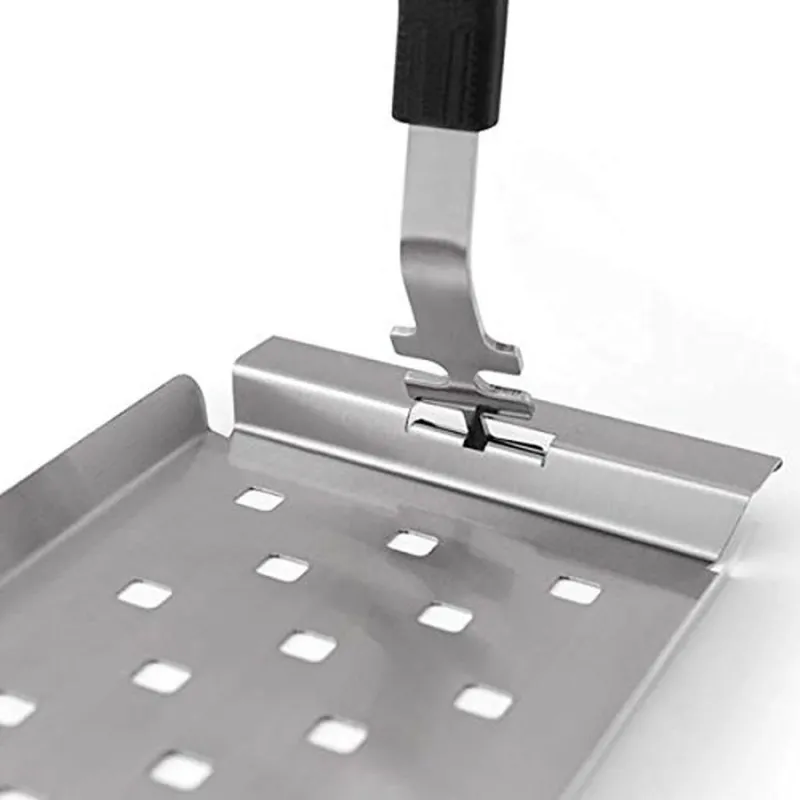 Новая улучшенная система для подъема решеток позволит Вам поднимать чугунные и стальные решетки грилей Broil King. Одна конфигурация зубьев для чугунных решеток, вторая – для решеток из нержавеющей стали. Лопатка сделана из нержавеющей стали и имеет резиновую ручку.