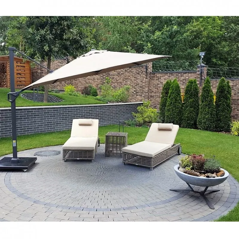 Цвет купола выполнен в цвете Taupe, стойка выполнена в цвете Anthracite. Материал класса 3, 100% полиэстер, 300 г / м2. Зонт может быть наклонен назад и с помощью педали Вы можете поворачивать его на 360 градусов.